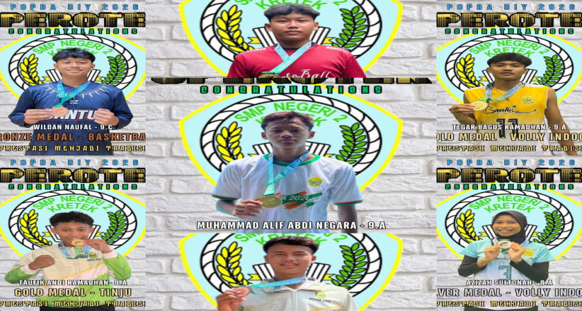 7 Siswa SMP Negeri 2 Kretek ikut berpartisipasi mengumpulkan 8 medali diantaranya 4 medali emas pada cabor voli putra indoor oleh Tegar Bagus Ramadhan Kelas 9A , tinju oleh Taufik Andi Ramadhan 9A, renang oleh M. Alif Abdi Nrgara 9A, dan gateball oleh Farel Bagas Adi Saputra 9C. sedangkang 2 medali perak pada cabor voli indoor putri oleh Azizah Sultonah 8A dan renang oleh M. Alif Abdi Nrgara 9A, serta 2 medali perunggu pada cabor voli pasir oleh Abriau Ozil Billal Angkasa 9A dan basket oleh Wildan Naufal 9C. Selamat untuk atlit-atlit dari SMP Negeri 2 Kretek semoga sukses. (diyan)